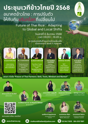 "อนาคตข้าวไทย: การปรับตัวให้ทันกับบริบทโลกที่เปลี่ยนไป" วันเสาร์ที่ 6 ธันวาคม 2568 เวลา 09:00 - 16:45 น ณ ศูนย์แสดงสินค้าและการประชุมอิมแพ็ค เมืองทองธานี ฮอล 11 |